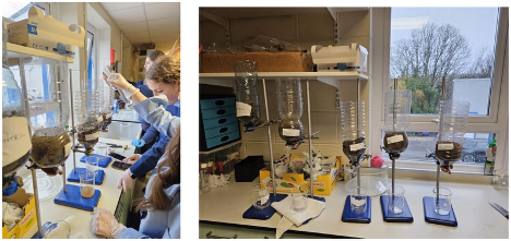 We decided to set up 4 test beds last March using horse manure, seaweed compost, a biological compost, and a mixture of all 3. A control bed was left untreated. We divided the bed into four areas and planted beans, potatoes, carrots, and onions. We monitored growth over the next 16 weeks and recorded soil temperature and pH. We also set up an apparatus to test the runoff from the soil that was used with our fertilisers vs slurry.