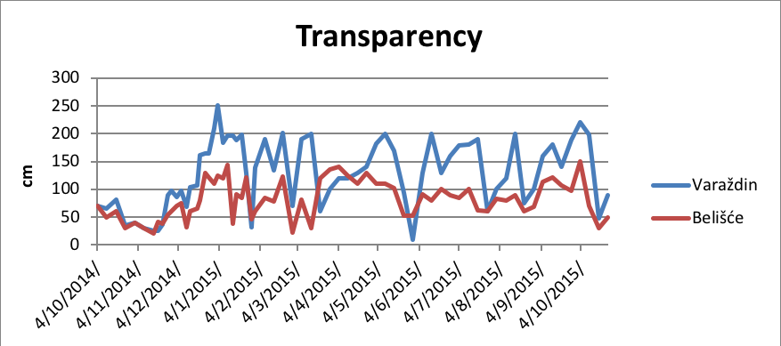 Chart 1 shows that the transparency of water was much higher at station Varazdin. The measured values were in the range of 10 cm up to 250 cm. The highest values of transparency were measured at the end of December and in January. Transparency was the lowest in October and November.