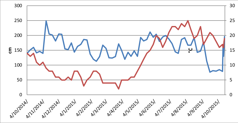 Chart 7. The dynamics of the water level (red line) and water temperature (blue line) at station Belisce.