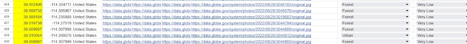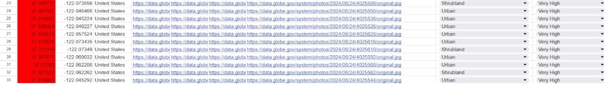 After selecting the sample points, the next step was to analyze the land cover at each location. Each row in the dataset contained the source code for an image, which we manually reviewed to identify the land cover type. The land cover categories included urban, forest, wetland, grassland, and shrubland. This detailed analysis allowed us to connect specific land cover types with corresponding wildfire risk levels, providing valuable insights into how different environments influence fire susceptibility. This process showed the importance of manual verification in ensuring data accuracy and reliability.