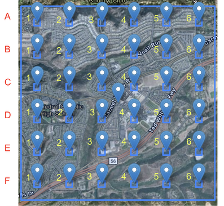 Next, I took a screenshot of my AOI grid in satellite view, and put it on a Google Slide. I labeled the rows and columns in “Battleship” style, with the rows as letters A-F, and the columns as numbers 1-6 (see Figure 1). This really helped me to identify which point I was going towards when I was walking between my points, as well as checking off the points and keeping track of the locations I needed to visit. For me, it was easier to look at the grid and say, “I’m at point E3,” compared to numbering the points as 1-37 and saying, “I’m at point 27” (what row is that? Where is that in my grid? I have no idea!).